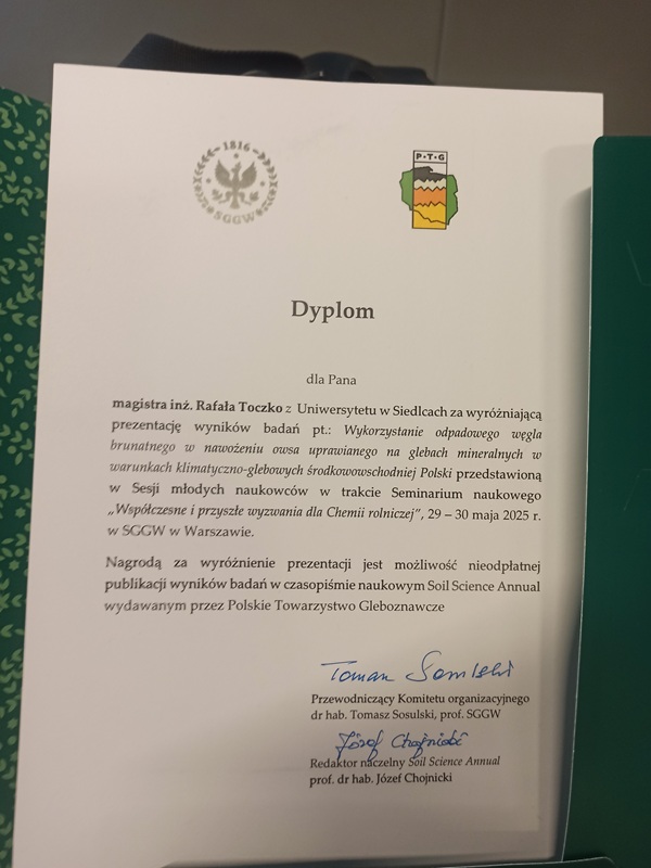 W dniach 29-30 maja 2025 roku w SGGW w Warszawie doktorant Rafał Toczko uczestniczył w seminarium naukowym "Współczesne i przyszłe wyzwania dla Chemii rolniczej".